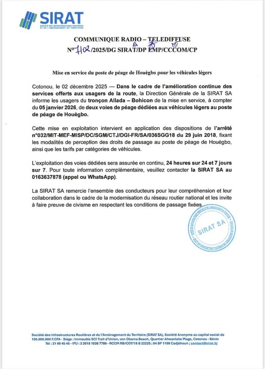 Dans sa dynamique d’amélioration continue des conditions de circulation au Bénin, la Direction Générale de la SIRAT SA annonce la mise en service de deux voies de péage exclusivement réservées aux véhicules légers au poste de Houègbo. Cette nouvelle organisation entre en vigueur à partir du 5 janvier 2026 sur le tronçon Allada–Bohicon.
