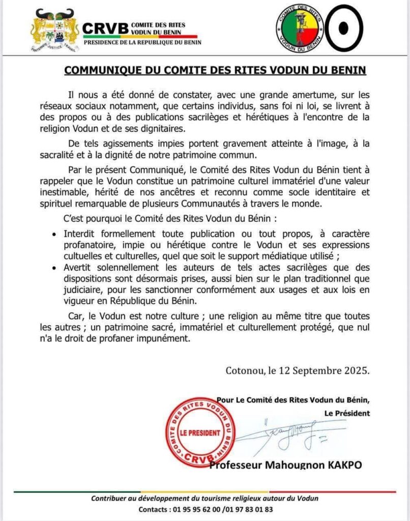 Face à ces dérives, le Comité des Rites Vodun interdit formellement toute publication ou propos à caractère profanatoire ou hérétique, quel que soit le support médiatique utilisé. Il met en garde les auteurs de tels actes et annonce que des sanctions traditionnelles et judiciaires seront désormais appliquées, conformément aux usages et aux lois en vigueur au Bénin.