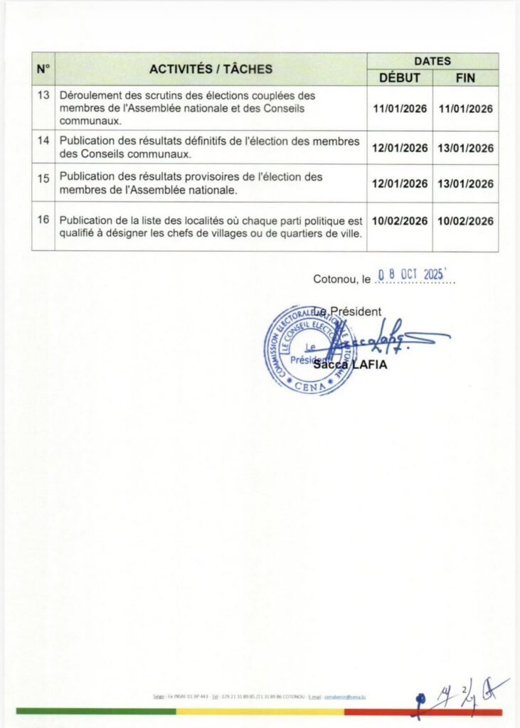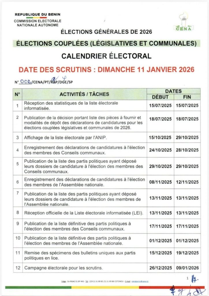 La Commission électorale nationale autonome (CENA) a rendu public ce mercredi 8 octobre 2025 le calendrier officiel des élections communales et législatives de 2026. Ces deux scrutins se tiendront de façon couplée le 11 janvier 2026 sur l’ensemble du territoire national.