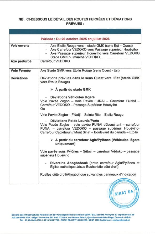Cette mesure temporaire vise à permettre le bon déroulement des travaux sur cet axe stratégique de la ville de Cotonou. La SIRAT précise que la circulation sera perturbée durant cette période et que des voies de déviation et couloirs provisoires ont été prévus pour faciliter le passage des usagers. Le détail de ces déviations est disponible dans un tableau joint au communiqué officiel.