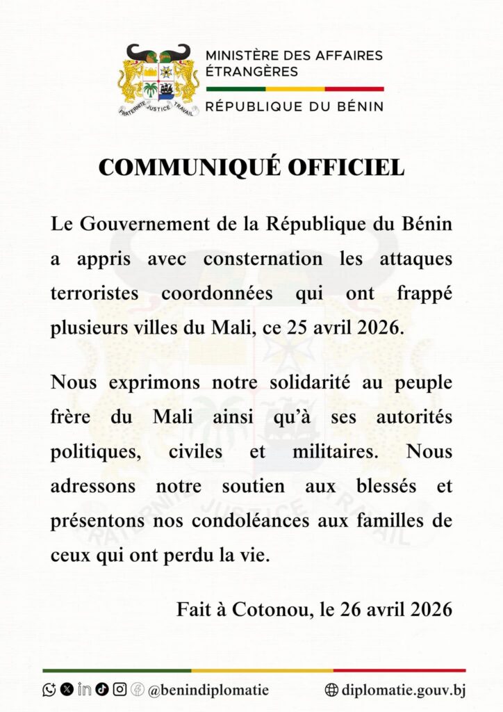 Le Gouvernement du Bénin a exprimé sa solidarité envers le Mali à la suite des attaques terroristes coordonnées qui ont frappé plusieurs villes maliennes le 25 avril 2026. Dans un communiqué officiel rendu public ce 26 avril à Cotonou, les autorités béninoises ont dit avoir appris ces événements avec consternation.