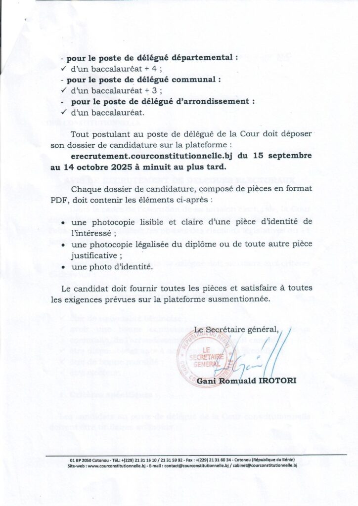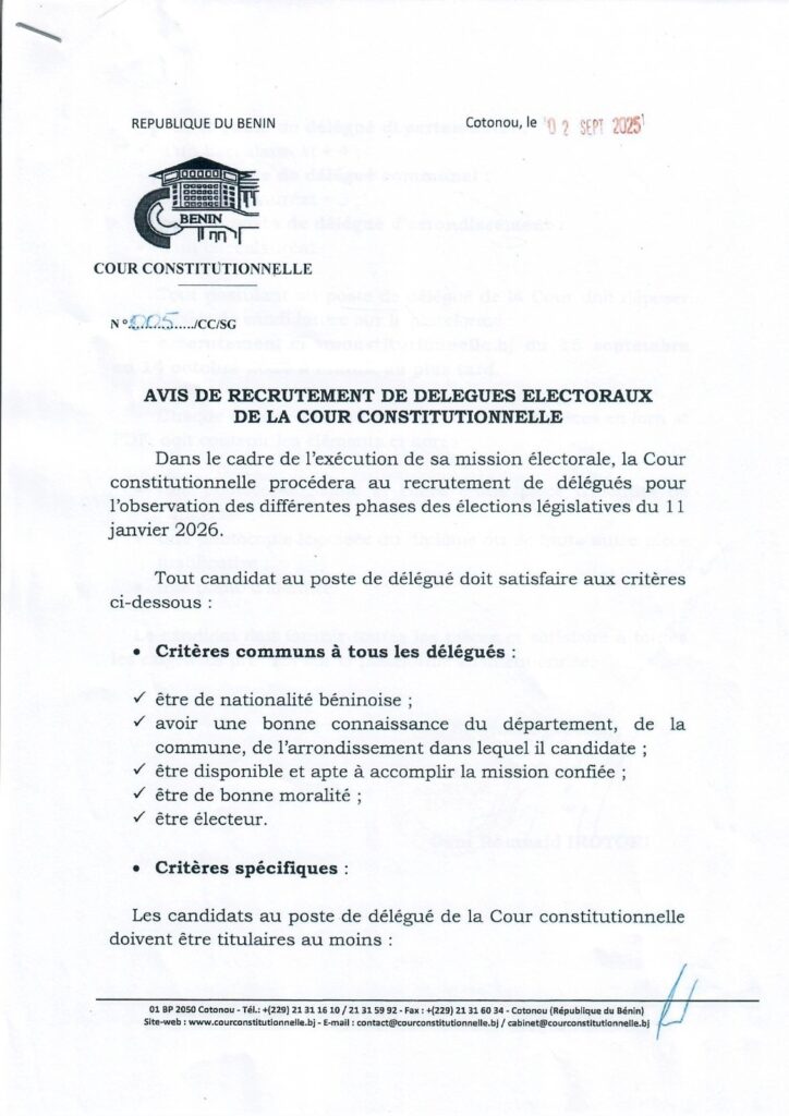 En perspective des élections législatives prévues le 11 janvier 2026, la Cour constitutionnelle du Bénin ouvre le recrutement de ses délégués électoraux. Les citoyens béninois, reconnus pour leur intégrité et leur disponibilité, titulaires d’un BAC, d’une Licence ou d’un Master selon le poste, sont invités à déposer leur candidature en format PDF via la plateforme officielle :