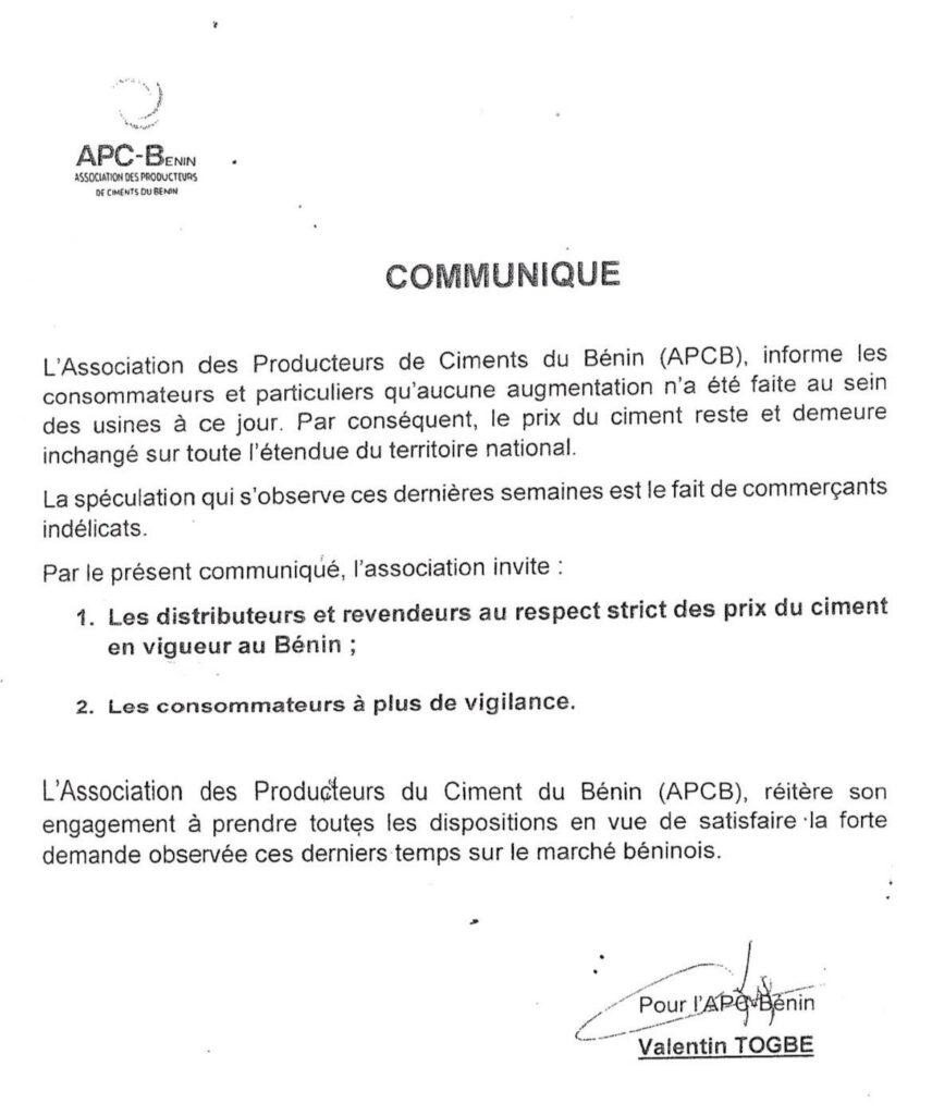 Association des Producteurs de Ciments du Bénin estime que les variations observées sur le terrain sont dues à des pratiques spéculatives de certains commerçants indélicats, et non à une décision des producteurs.
