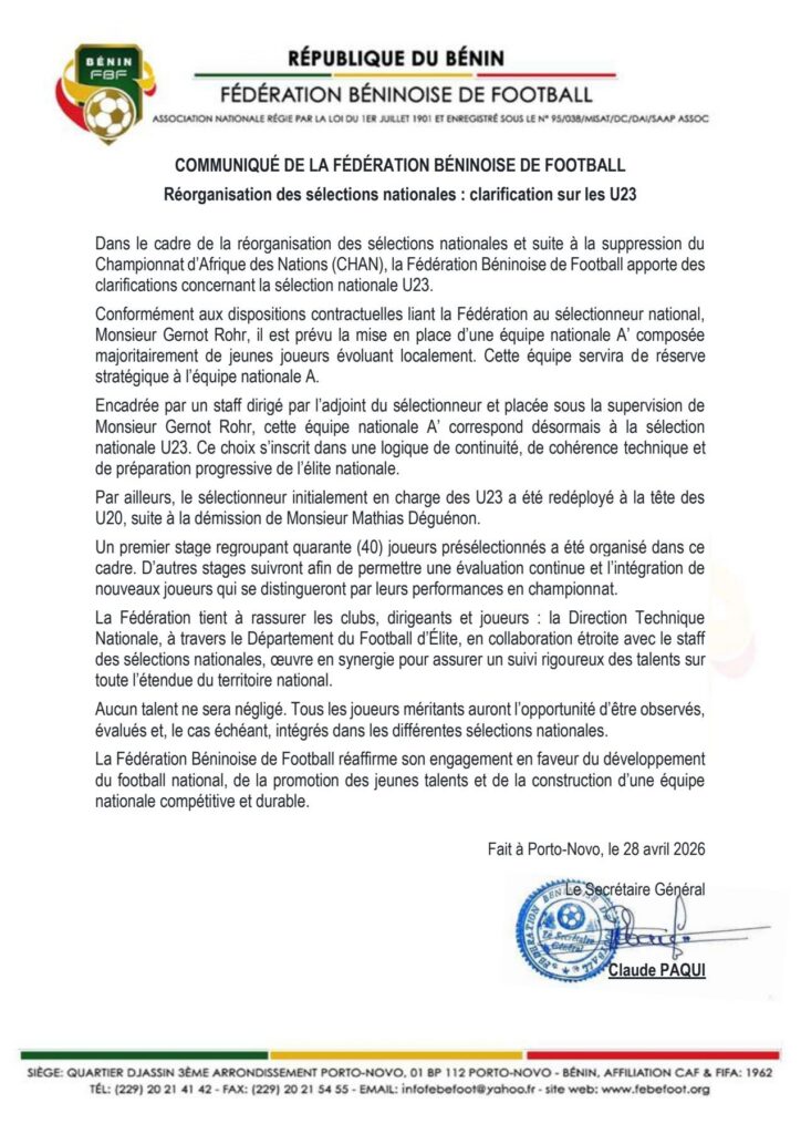 La Fédération Béninoise de Football a officiellement annoncé une nouvelle organisation de ses sélections nationales, avec une évolution majeure concernant la catégorie des U23. Désormais, cette sélection est intégrée à l’équipe nationale A’, dans le cadre d’une réforme stratégique engagée par l’instance dirigeante du football béninois.