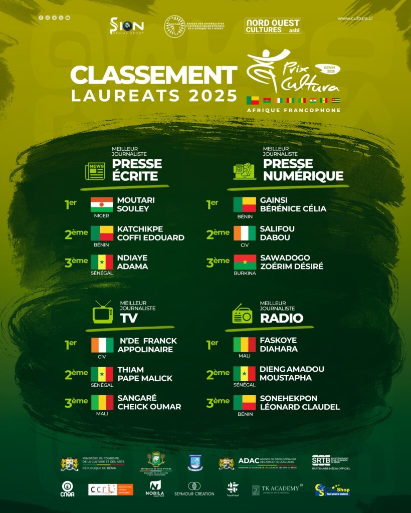 Pour rappel, le Prix Cultura est porté par Sion Médias Group, le Réseau des Journalistes Culturels de l’Afrique de l’Ouest (RJCFAO) et l’Association Nord Ouest Cultures. Son ambition : mettre en lumière le travail des professionnels de l’information culturelle, encourager l’excellence et renforcer les échanges entre journalistes de la région.