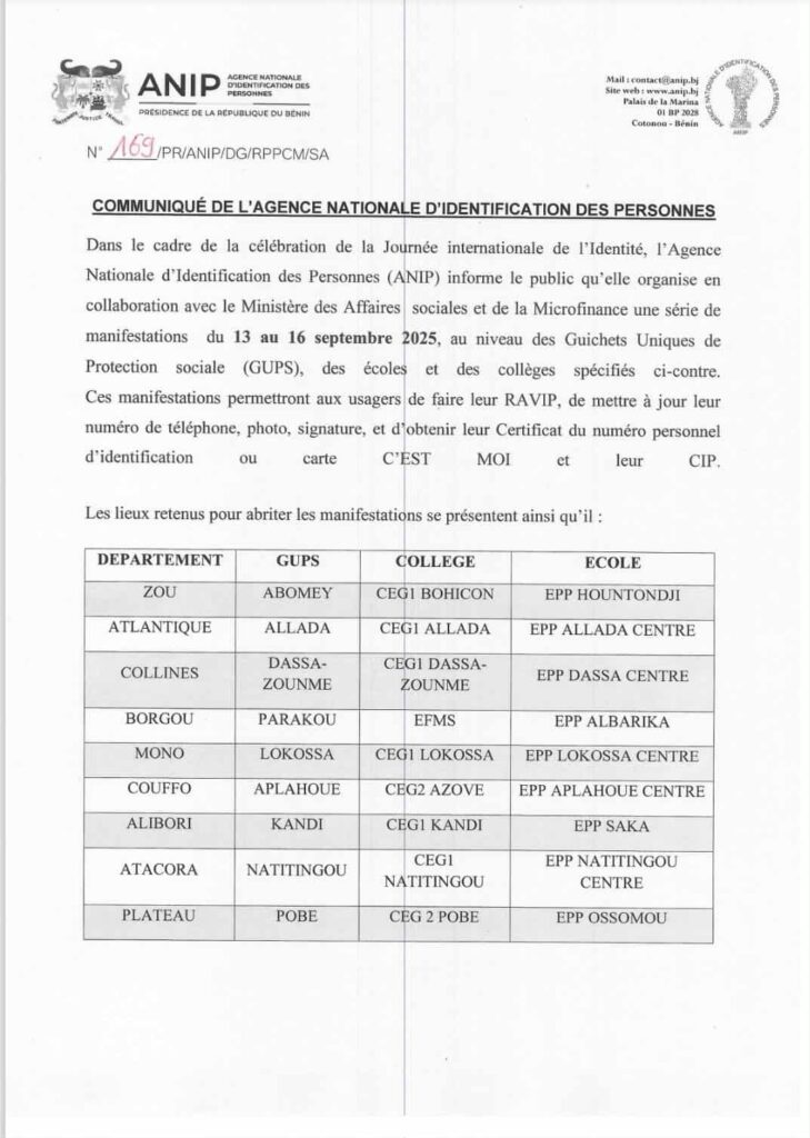 À l’occasion de la Journée internationale de l’Identité, l’Agence Nationale d’Identification des Personnes (ANIP), en collaboration avec le Ministère des Affaires sociales et de la Microfinance, organise du 13 au 16 septembre 2025 une série de manifestations dans plusieurs villes du Bénin.