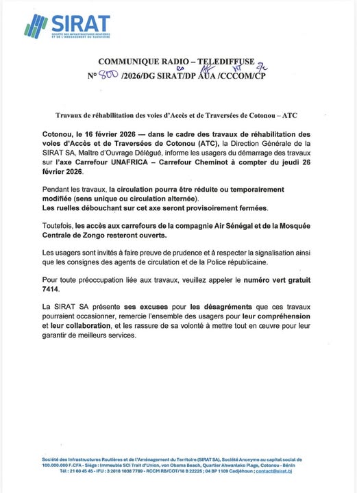 Dans son communiqué radio-télédiffusé en date du 16 février 2026, la SIRAT SA, Maître d’Ouvrage Délégué, informe que la circulation sera réduite ou temporairement modifiée pendant toute la durée du chantier. Des mesures telles que la mise en sens unique ou la circulation alternée pourront être appliquées afin d’assurer la sécurité et le bon déroulement des travaux.
