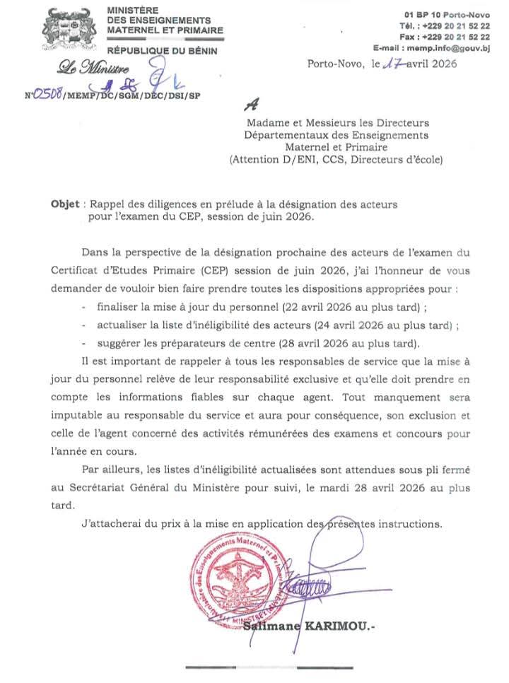 Le Ministère des Enseignements Maternel et Primaire (MEMP) a adressé, le 17 avril 2026 depuis Porto-Novo, une note officielle aux directeurs départementaux pour rappeler les mesures urgentes à prendre en prélude à l’organisation de l’examen du Certificat d’Études Primaires (CEP), session de juin 2026.