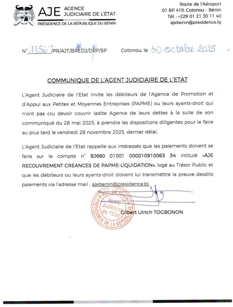 L’Etat veut sévir face aux débiteurs de PAPME. Dans un communiqué en date du 30 octobre 2025 signé par Gilbert Ulrich Togbonon, l’AJE rappelle que malgré l’appel lancé le 28 mai dernier, certains débiteurs ne se sont toujours pas exécutés. Il leur accorde donc un ultime délai, fixé au vendredi 28 novembre 2025, pour régulariser leur situation.