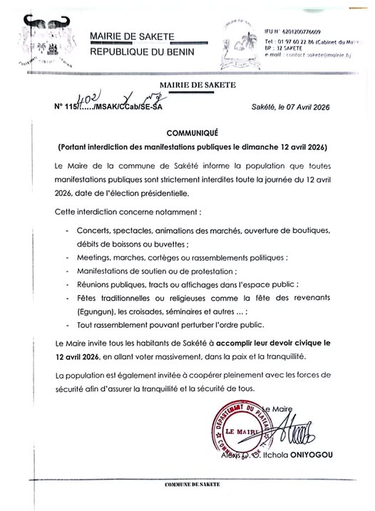 La mairie de Sakété a annoncé ce mardi 7 avril 2026 l’interdiction de toutes manifestations publiques dans la commune le dimanche 12 avril, jour de l’élection présidentielle. Cette décision a pour objectif de garantir la tranquillité, la sécurité et le bon déroulement du scrutin.
