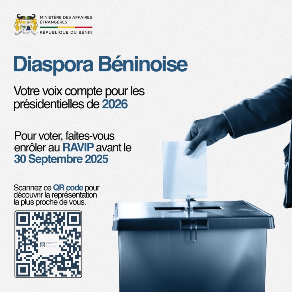 Les préparatifs pour l’élection présidentielle de 2026 au Bénin sont en cours. A travers un communiqué officiel, le ministère des affaires étrangères invite les Béninois vivant à l’étranger à accomplir une démarche essentielle pour faire entendre leur voix : s’enrôler au RAVIP avant le 30 septembre 2025.