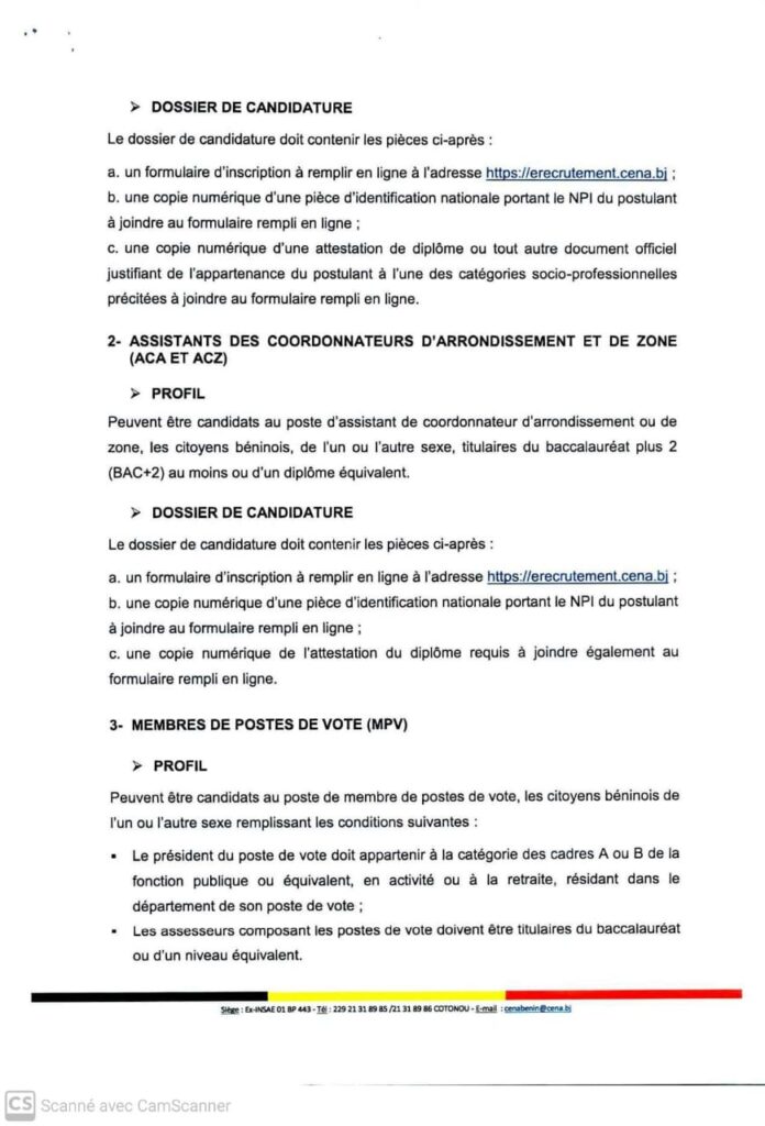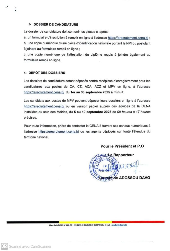 Les citoyens intéressés sont invités à soumettre leur dossier conformément aux conditions et modalités fixées par la CENA. Ce recrutement vise à renforcer l’organisation et à garantir le bon déroulement du processus électoral de janvier 2026.