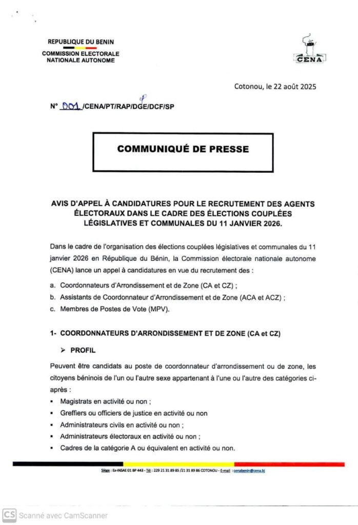 En perspective des élections législatives et communales prévues pour le 11 janvier 2026, la Commission électorale nationale autonome (CENA) a annoncé le lancement d’un recrutement d’agents électoraux. L’information a été rendue publique à travers un communiqué officiel en date du vendredi 22 août 2025.